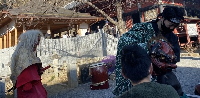 マダラ鬼神祭の鬼と獅子舞を見ました。獅子舞に頭をかんでもらい、今年こそは無病息災の年になるといいな、と祈りました。