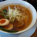 味玉醤油ラーメンをオーダー。 待つこと7~8分、着丼。 まずはスープ。 あっさりしていて、なかなか。 麺は細麺ストレート。 キチンとスープが絡み、旨い。 具はチャーシュー3切れほど、海苔、味玉、ネギ、ホウレン草。 味玉に強めに味がついており、スープに浸かっていなくても、濃いめの味付け。 ごちそうさまでした。