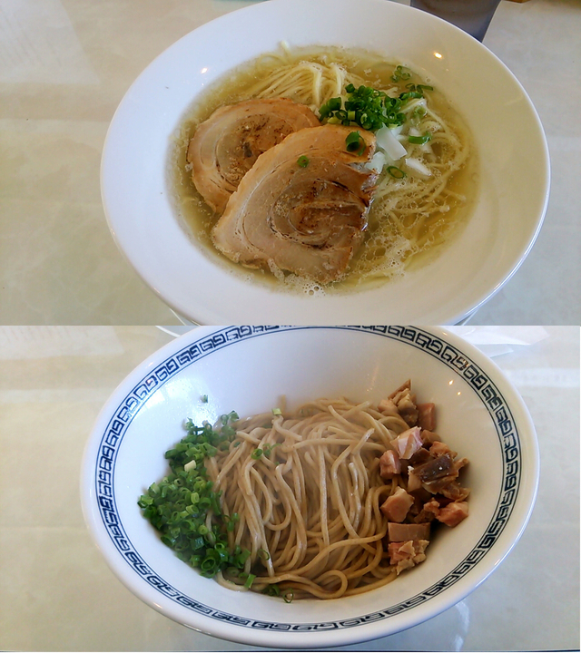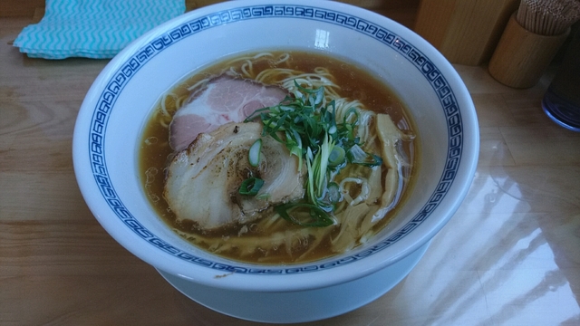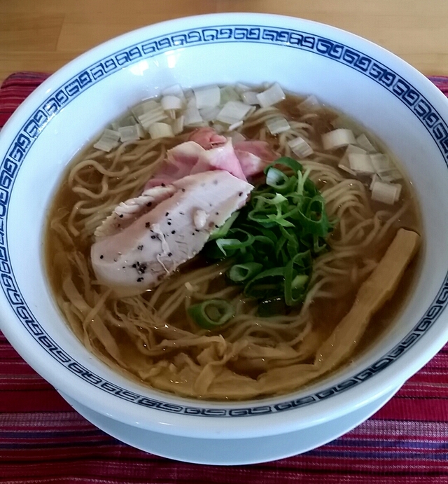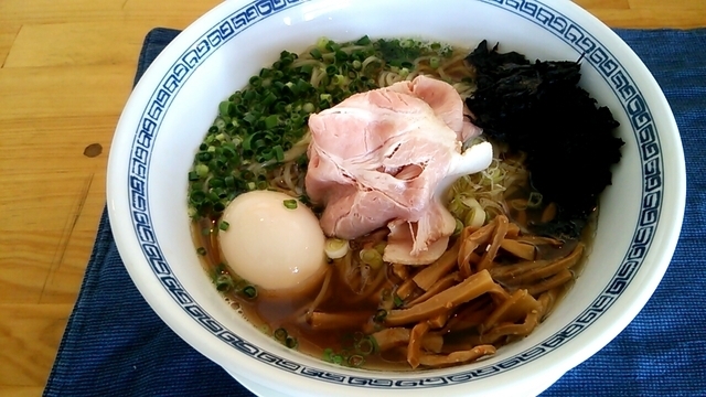 日曜夕、市内の温浴施設「いこいの郷 常総」に行ったついでに久しぶりに再訪しました。限定メニュー「淡麗生姜そば塩」なるものが出ていたので、これとクーポンの味玉を注文。夜の部が始まってあまり時間が経っていないはずですが、当方の注文で本日分の限定は売切になり、盛況のようです。阿波尾鶏(踊り?)という鶏の出汁に多量の擦りおろし生姜が加わり、これを塩ダレで味付けした清湯に中細麺が浸っています。具材は、柔らかくボリュームのある鶏モモ肉叉焼2枚、刻みタマネギにメンマ。これに追加の黄身が流れ出す半熟味玉1個。清湯が熱々な上に、擦りおろし生姜の辛味で身体の芯から温まるとともに、鶏の旨味が実に美味しい逸品。完食完飲でした。