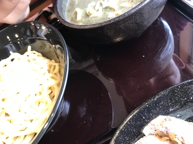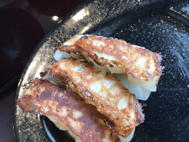 夜に再訪し、今回は煮干しチャーシュー中華そば醤油とクーポンサービスの餃子(5個)を食しました。醤油スープには香り高い煮干し油が分厚く浮いて、なおかつ美味。具は約1cm厚の厚切り豚バラ叉焼3枚、海苔1枚、刻みタマネギ、刻みネギにメンマでした。併せて食した餃子はごく普通。