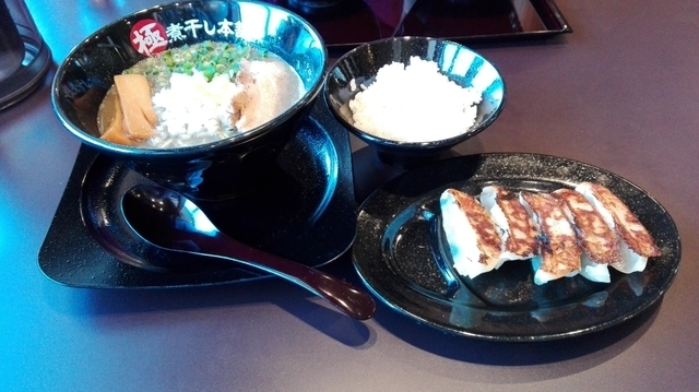 お昼時、連れと二人で食べてきました。 ランチのセットメニューから、ライスと餃子を選びました。ラーメンは極濃煮干しラーメン 煮干しを丸ごとふんだんに使っているのでしょう。