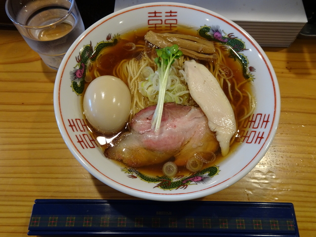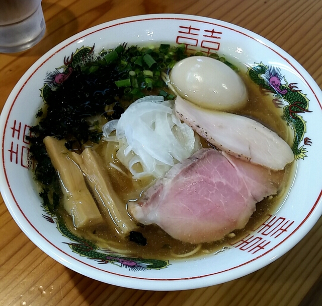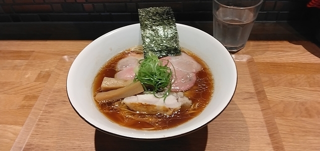 初訪問です。 食券制で、醤油ラーメンをポチり。 カウンターに通され、約10分後、着丼。 まずはスープ。醤油強めだが、塩っぱくはなく甘みがある。 麺は細麺。冷麦くらいの太さ。 具は、太めのメンマ、レアチャーシュー1枚、軽く炙った鶏チャーシュー1枚。 ごちそうさまでした。