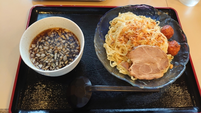 暑かったので冷たいつけ麺。 冷たく平らな麺を冷えたつけ汁でいただきます。 しっかりした中にすっきりとしたつけ汁で箸がすすみます。フライドオニオン?がボリューミー。 軟骨入りのつくねは温かくてアクセントになっている。 おいしゅうございました。