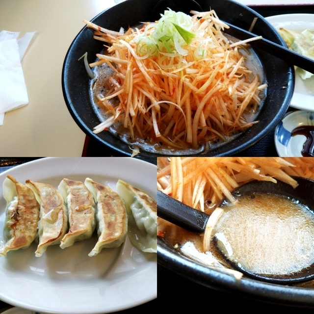 再び夜に立ち寄りました。ここはススキノ系味噌ラーメンが売りでしょうが、今回は広東メンと餃子(6個)を試してみました。味噌/塩系のラーメンでは太麺使用ですが、醤油系のラーメンでは細麺使用とのこと。醤油スープは出汁も利いていて美味ですが、ごく普通の広東メンというところ。具は白菜・キャベツ・木耳・ニンジン・ピーマン・シナチク・豚バラ肉・ナルトを含む餡かけで、ウズラ茹で玉子1個が添えられてます。餡かけで夜寒の中、温まりました。餃子は結構柔らかく仕上げられてました。
