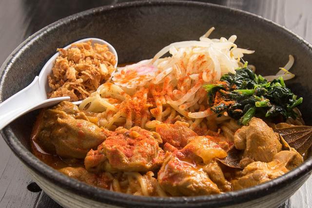 九里林大みか店限定のスパイシーカレーまぜそば!!ゴロゴロの鶏肉もまたジューシーで美味!!