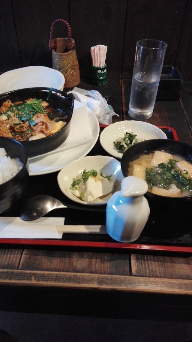 ランチで初めて訪れました。店内に入るとかなり凝った設えで、小さな滝と遣り水が印象的。また、結構広々としています。ランチメニューはいろいろありますが、店お勧めで限定の豚キムチ鍋定食を注文。やがて到来した膳には、豚キムチが熱々に煮立った鉄鍋、ご飯、味噌汁(ナメコ/豆腐/ネギ)、トロトロ気味の冷奴と漬物(キュウリとカブの浅漬)の小皿が載っています。豚キムチの具は豚バラ肉、豆腐、白菜キムチ、ニラ、エノキ、ネギ、もやしにゼンマイ。旨辛で美味しく、お替わり自由のご飯2杯を食して満腹となりました。