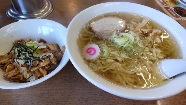平日のお昼に3人で来店しました。 お昼どきなので、先客、後客ぞくぞくと来ていました。 佐野ラーメンを唱っているので、佐野ラーメンとランチのミニチャーシュー丼(250円→100円)にしました。 ラーメンは、スープはあっさりとしていますが、味そのものは濃いめにしっかりついていて、縮れ麺と絡んでおいしくいただけます。 具は、チャーシュー、ネギ、ナルト、メンマとシンプルな仕上がりになっています。 チャーシュー丼は、メニューの写真と比べると微妙過ぎますが、100円なので…と思える感じです。 さらに、100円券で100円引きが無限ループなのでありがたいです。 近くに来た際には、寄りたいと思います。
