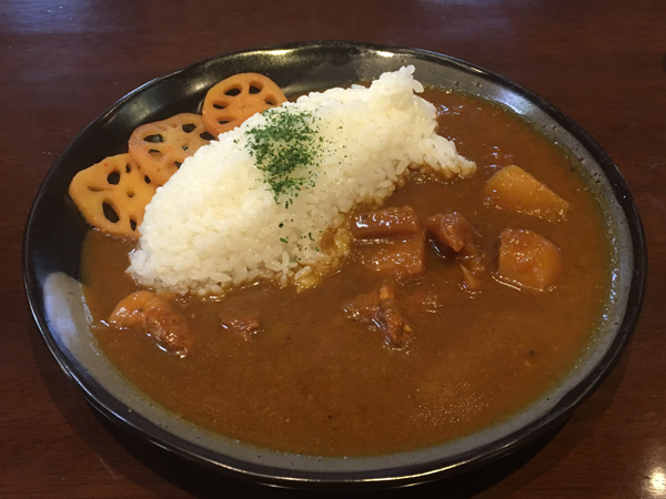 天童フェアで土浦まちかど蔵・野村を訪れた際、隣接の煉瓦蔵のこちらへ昼食で立ち寄りました。壁の高い位置にステンドグラスが入っているなど、なかなか洒落た雰囲気です。カレーの街土浦なのでツェッペリンカレーとトアルコトラジャをいただきました。皿に盛られたカレーはやや黒っぽいポークカレーで、豚肉、ジャガイモ、レンコンがそれぞれブロック状に入っています。辛さ指定は無いですが、甘~中辛程度と万人向けですかね。ライスは本ページ写真にあるようなターメリックorサフランライスでなく、白飯ですが、それを飛行船型にかたどっており、たぶんツェッペリン号の船体色に近くしたのでしょうか。付け合わせにレンコンの福神漬が3枚添えられていました(味は普通の福神漬でした)。質・量からするとやや良い値段かと。