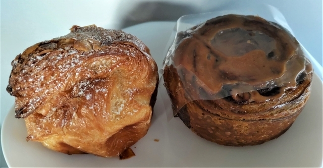《クロワッサンB.C》240円 個人的にイチオシのパンは、クロワッサンB.Cです。 アーモンドケーキをクロワッサン生地で包んで焼き上げたパンです。 ぐるぐるシナモン(¥240)は、普通のシナモンロールと違って、シナモンフォンダンがたっぷりと かかっています。中にはクルミが入っています。