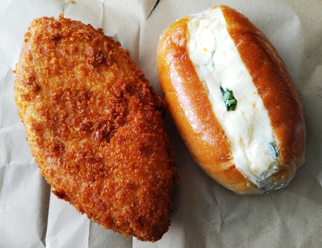 【2種類あるカレーパン】 ぐるぐるさんには、カレーパンが2種類あります。普通のカレーパンとカレーと一緒に半熟玉子が入ったカレーパンです。今回は『もっと具だくさんカレーパン』(260円)という普通のカレーパンを購入しました。衣は結構カリッと揚がっていて、中のカレーはあまり辛くありませんでしたが、おいしくいただきました。ポテトサラダサンド(120円)もおいしかったです。