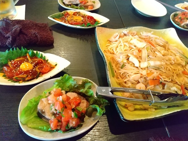 海鮮塩焼きそば、具沢山で美味しかったです。 お通しのまぐろのユッケ、あとなんだっけかな、どちらもGOODでした。