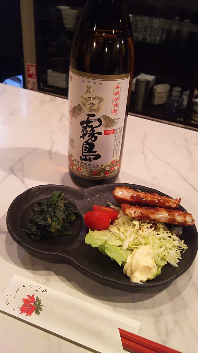 明けましておめでとうございます。 さっそく白霧島を頂きました。 20度でさらっとしていてロックで美味しく飲めます。 今日のお通しはチーズ入りの薄いカツ、ほうれん草のごま和え。 お腹が空いていたのでわがまま言ってナポリタン作ってもらいました。 美味しかったー。