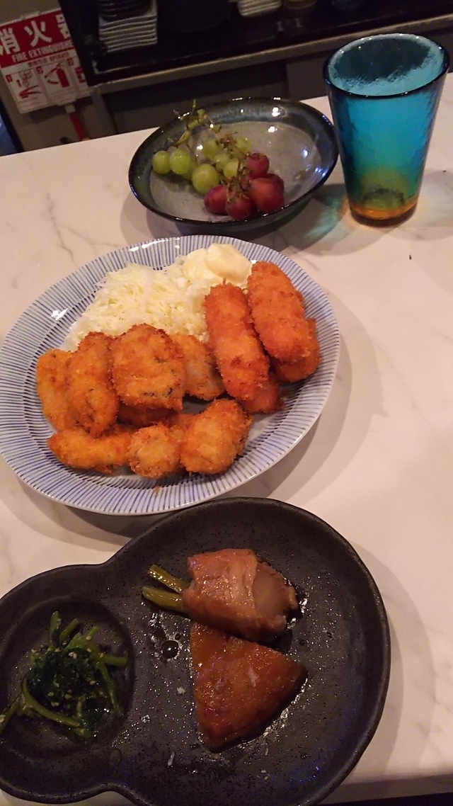 牡蠣フライです。 外はサクッと中はプリッ! 僕はウスターソース派! サクサクの衣の中から出てくるジューシーな牡蠣汁(?)、肉厚でぷりっぷりな牡蠣。 新鮮な牡蠣は生で食べるのも醍醐味ですが、実は新鮮な牡蠣ほどカキフライにすると美味しいのも事実です。 炎のシェフに無理言って、揚げ物ついでに丸善ソーセージも揚げてもらいました。(笑) うまかった~! 忘年会は庵ですな。(笑)