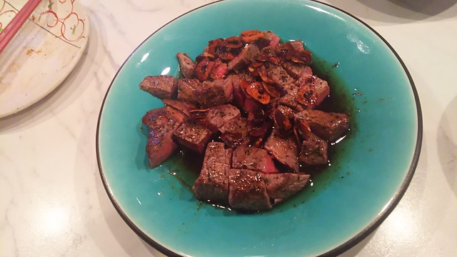 大平ジモピーです。 牛ランプ肉ステーキです、前もって注文し出してもらいました。 ランプはモモ肉の一部で、特に柔らかく肉の旨みが堪能できる赤身のお肉です。 サーロインやヒレよりも美味しいと思います。 オリーブオイルで焼いてもらい、にんにくチップと醤油で味付けしてもらいました。 いやー、旨かった! みなさんもお試しあれ。