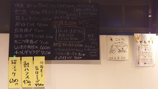 壁にぶら下がってた川海老入り塩焼そば、桜ユッケを頼んでみた。 どちらも激ウマでしたよ。 張り出してるだけのことはあります。