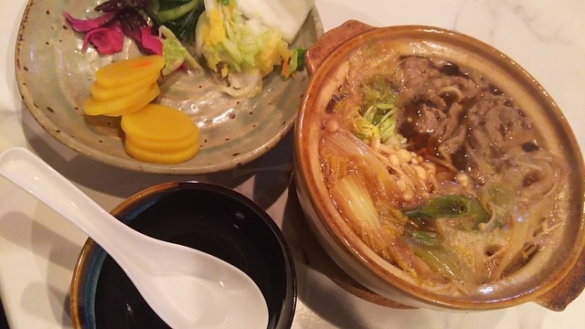 この日は寒かったので、友人と話し合い、新メニューすき焼き鍋を食べることに。 注文すると、美人な店員さんが、しばらくして、厨房でこしらえてくれたすき焼き鍋を運んでくれます。すき焼きは、割り下を使った関東風で、味のバランスもちょうどいいです。