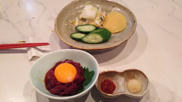 桜ユッケです、珍しい。 馬肉自体の脂肪分は感じず、あっさり。 秘伝のタレと卵と薬味で美味しくなってます。 想像していたのと大違いで臭みも癖もなく甘くて美味しい。箸が止まらなくなります。 桜ユッケ なぜ馬肉を「さくら」と呼ぶかというと、馬肉の切り身がさくらの花びらを連想させ、また、桜の季節の馬肉が脂がのって美味しいとのことから桜ユッケとなった由来だそうです。