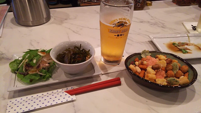 お通しは旨いし。カツオのたたきと切り昆布の煮物。あまり濃くしていないのでさっぱりと食べられます。 ビールにはナッツでしょ。合いますyo!