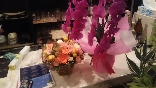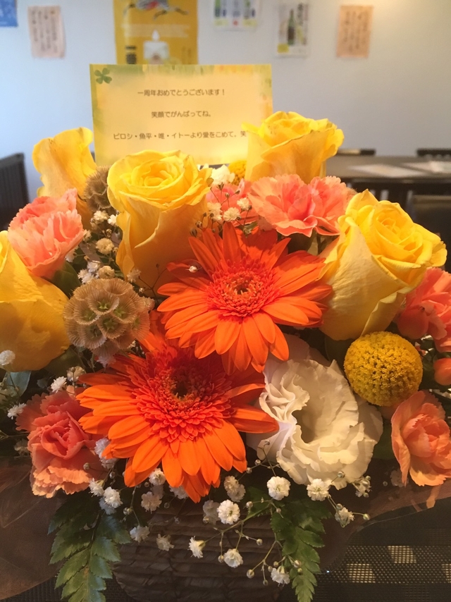 庵が1周年を迎えました。 .☆.+:^ヽ(∇^*)o【♪祝♪】o(*^∇)ノ^;+.☆. 綺麗なお花が飾ってありました。 これからも楽しい場所として美味しい料理を食べさせてください。