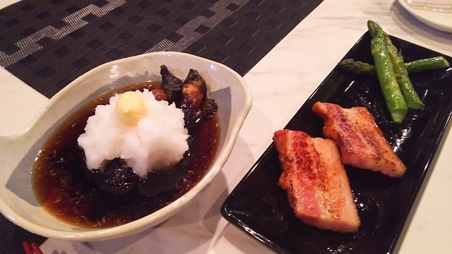 茄子の煮漬し&厚切りベーコンとアスパラ(食べかけ)です。 どちらも美味しかったです。 シビック前ではドイツビールフェアやてましたよ。