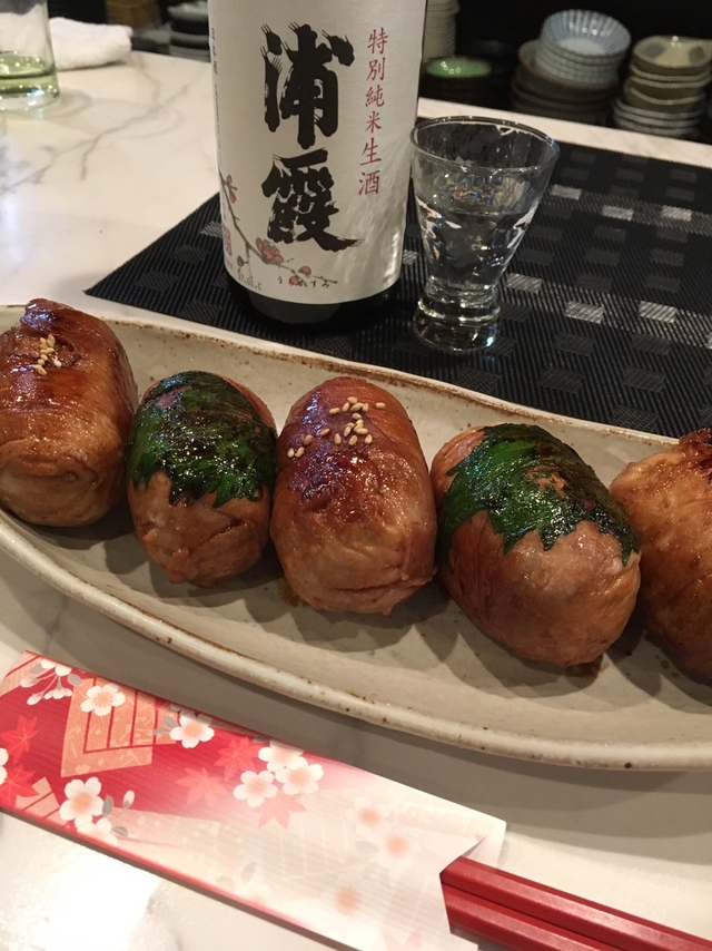 大平ジモピーです。 肉巻きおにぎりです。 旨いね~! おなかいっぱい。笑w 浦霞を飲みながらいただきました。