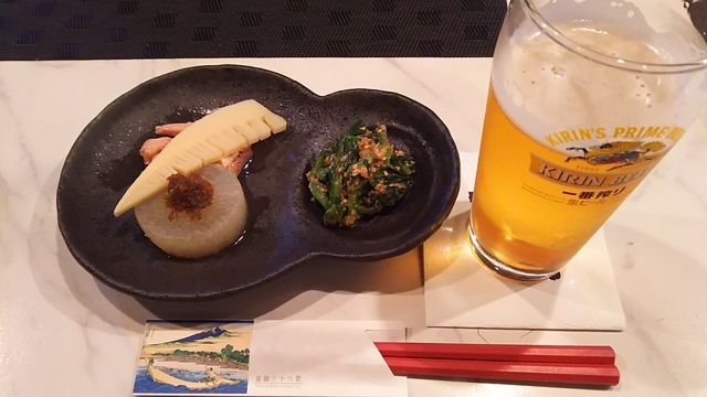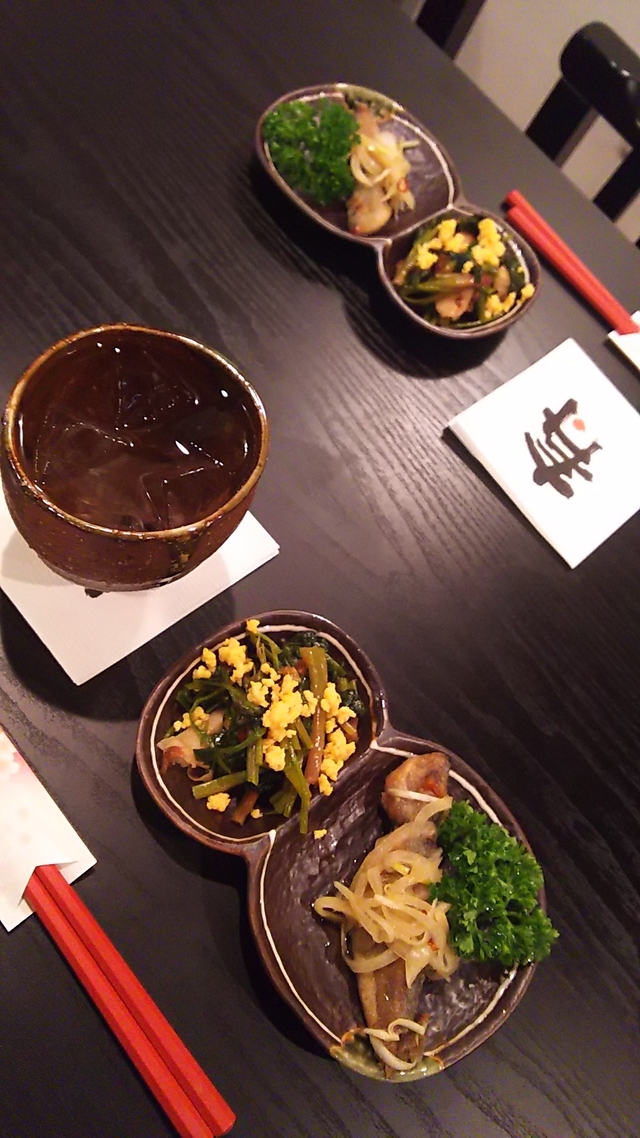 大平ジモピーです。 今宵のお通しです、あいかわらず手が込んでます、素晴らしい! ほうれん草といり玉子、ちくわの炒め物です。 甘くて美味しかった~。 あと、小アジの南蛮酢、こらも絶品! お通しだけでじゅうぶん飲めます!
