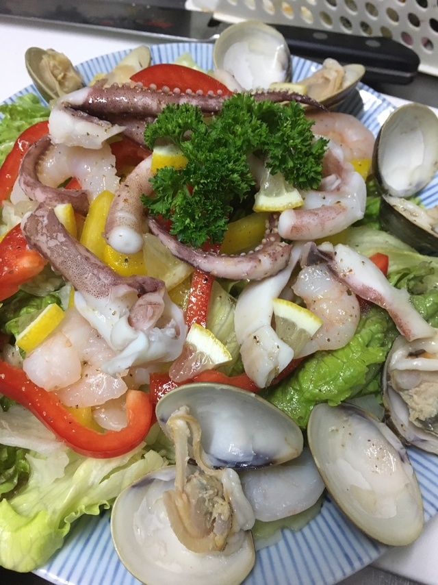 ピロシで~っす! 昨日は風が強くてたいへんでしたね。 なんでも、平和通りの桜の木が2本倒れたとか。 今宵はシーフードサラダ(スペシャルバージョン)です。 新鮮なシーフードとしゃきしゃき野菜。 早く食べよっと。
