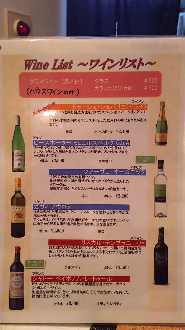 ワインメニューです。 ソアーベ オーガニック(白)、 りスカル・テンプラニーリョ(赤)、 まずはこの二本制覇。