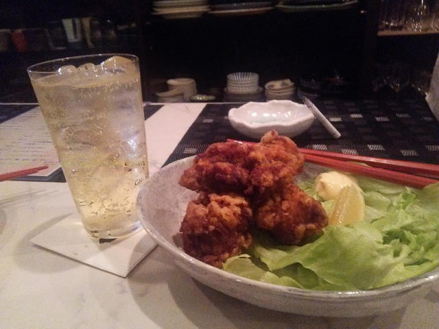 ハイボールと鳥の唐揚げです。 今はやりのハイカラですね。 お店のお姉さんがCMでやっているような感じで作ってくれます。 是非、男の人はお店で試してください。