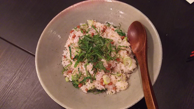 納豆チャーハンです。 ねばねば感も少なく、納豆の味もしっかりと残っていて、 それでいてしょっぱうまい! 地酒大観大吟醸を飲みながらいただきました。 日立にきたら納豆&大観でしょ。笑w