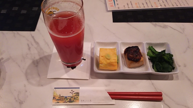 今日のお通しです。 玉子焼き(豆入り)、豆腐の味噌田楽、菜の花からし和えです。 全て手づくり。 玉子焼きはほんのり甘く、豆を入れることで食感もよし。 豆腐の味噌田楽は口に含むと甘い味噌ですが、青唐辛子を和えてあり、最後にピリッとした辛さがあります。 菜の花からし和えは、からしを抑えてありさっぱりした感じ。豆腐の味噌田楽がピリ辛なので、あえてさっぱりにしてあるとのことでした。 バランスよく考えられています。
