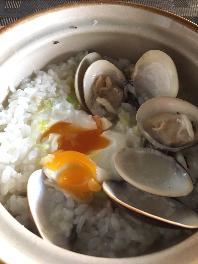 お腹減った~と言ったら、まかない飯あるけど食べる? って出してくれました。 あさりの酒蒸し風おじやです。 なんでしょ、すごく美味しかった。
