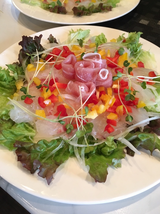 魚平です。 真鯛のカルパッチョです。 カルパッチョソースをかけ、さらにワサビマヨで食べます。 美味すぎる!
