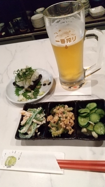 サクッと美味しいもの食べて早く寝たいそんな日、こんなところろにこんな店があったかな?と暖簾をくぐり店内へ。どうやら、カウンター席には近所の常連さんが多い模様。 ビールは麒麟一番搾り。良し! 手作りつくねがオススメらしい。 まずはお通しから。こりゃ旨い。どれも店主のこだわりが伺える。 今宵はよく眠れそうだと店をあとにした。