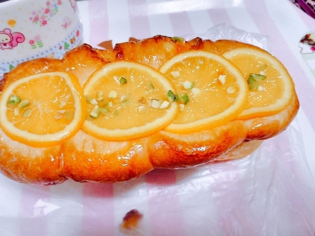 オレンジブレッド オレンジのスライスがパンの上にON♪♪ パンはふわふわでおいしかったです!!! 今度はバーガーなどお惣菜系のパンを食べてみたいです♪