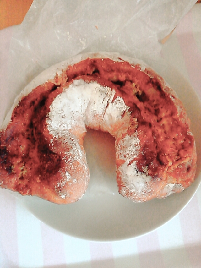 いちごのラウンドパン♪♪ お店の前には旗も立っていておすすめパンみたいです!! 少しお高めですがとってもおいしかったです☆ 苺の果肉もはいっていました。
