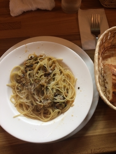前回気に入ったので連れと昼再訪。雨でも混んでいて人気は本物かと。今回は前菜のないBランチを注文(つき出しでカナッペのサービスが)。サラダには甘いニンジンドレッシングを選び、7種のパスタからは、椎茸/舞茸/しめじのペペロンチーノ大盛(連れは海老風味トマトクリームソース)を選択。フランスパンとともに来る丸パンはポテトを練り込んであるのだとか。4種のデザートからアーモンドのセミフレッド(連れはティラミス)とホットコーヒーを。パスタが置かれると、パルメザンチーズを削りかけてくれます(海老風味・・では無し)。やはりアルデンテで美味しい。セミフレッドは一種のアイスクリームで、甘い口直しとなりました。
