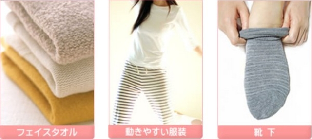 ①フェイスタオル1枚 (手ぬぐいサイズ 肩幅くらいのもの) ②ジャージ又はスエットのような柔らかい素材の服装 (院内に更衣室が2室ございます) ③靴下1足 (洗濯済みの清潔なもの、施術前に履き替えていただきます)
