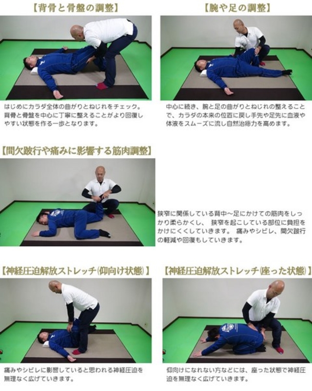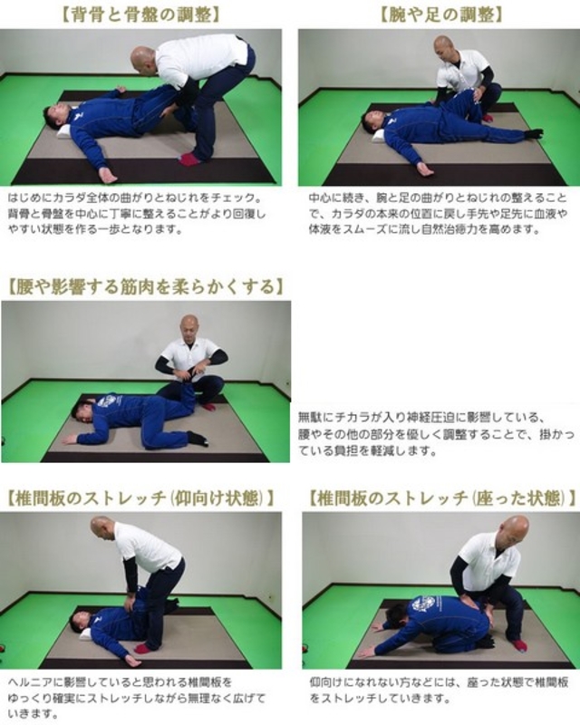 基本的に神経を圧迫して起こる症状なので、圧迫する原因を解消していきます。 多くの方は、からだの曲がり・ねじれがとれていません。 骨盤まわりを中心に筋肉が硬くなっているし、関節も遊びがなくなっています。身体の使い方も間違っていることが多いようで足が正しい位置よりもねじれている(O脚など)こともあります。 ①からだの曲がりねじれを正す。 カラダと言っても胴体と腕と足の各部の曲がりやねじれを正しい位置に戻します。 ②尻・ももの裏・お腹などコリ固まった筋肉を徹底的に柔らかくする。 腰痛持ちの方は下半身のアッチコッチが硬くなっていま す。一つ一つ柔らかくしていきます。 ③関節にも遊びをつけていき、関節の遊びをつける。 ヘルニアが影響している関節を広げていく数種類の施術で椎間 板を回復させます。