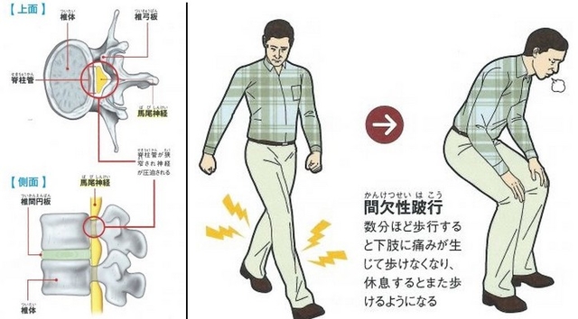狭くすぼまっていることを狭窄(きょうさく)と言います。 背骨の背中側にある神経の通る管(脊柱管)が加齢、重労働、年をとると骨の変性、椎間板の変性などの原因で狭くなってしまい神経を圧迫して起こる症状です。 《症状》 ◆特徴1.歩いているとだんだん痛みやしびれが辛くなりますが、前かがみになって休むとまた歩けるようになる間欠跛行(かんけつはこう)が見られます。 ◆特徴2.体を反ると痛みが強くなます。両側や片側のお尻やふともも、ふくらはぎ、すね、足先などに症状が出る。 ◆特徴3.歩行時の尿意や便秘などの排尿障害。 ◆特徴4.スリッパが抜けやすいなどの足に筋肉に力が入らない。 ◆特徴5.触っても感覚がない