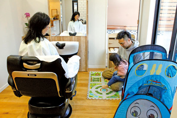 また、キッズスペースを完備していますので、隣でお子様が遊ぶ様子を見ながらの施術も可能!シャンプーの際、移動する必要もありません。足のムクミが気になる方の為にリラックスチェアもご用意しております☆