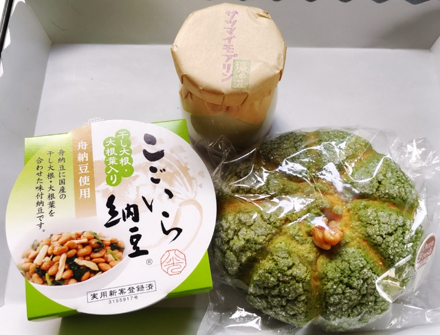 地元特産品の中から「こごいら納豆」と「環の花サツマイモプリン」を購入しました。 「こごいら納豆」は、舟納豆に干し大根と大根葉が入った納豆で、そのままごはんにのせてたべられます。(324円) 「サツマイモプリン」は期間限定で、やや堅めのプリンです。ほのかにサツマイモの風味がしました。シンプルなプリンもあり、そちらは常陸大宮市の特産品に認証されています。(320円) ついでに、カボチャの形をしたパンを購入しました。カボチャクリームが入っていて、生地にもカボチャが練り込まれて、オレンジ色していました。おいしかったです。(200円)