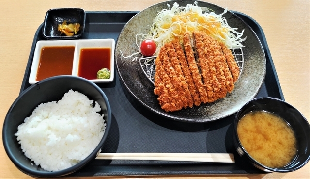 【牛カツ定食】1200円 フードコートの瑞穂牛キッチンCOWCOWで牛カツ定食をいただきました。 常陸大宮市産の瑞穂牛を使った牛カツで、厚さは1cm位でした。 しっかりと揚げてあったので、自分の好みとしてはもう少しレアであれば、柔らかくおいしかったのではないかと思いました。 わさび醤油とデミグラスソースが付いていて、2つの味でおいしくいただきました。