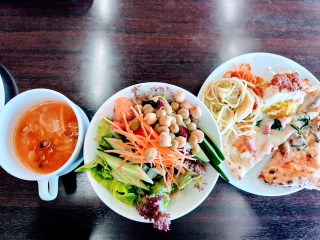 レストランでランチをしました!ビュッフェです!品数は多少少ないですが、味はとっても良かったです!ソフトクリームも魅力的。ミネストローネとピッツァも美味しかったです。