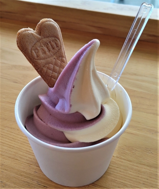 《巨峰ミックスソフト》350円 農産物直売所の反対側奥にある、Hitachi Gelatoでは、ジェラートやソフトクリームなどを販売しています。この季節に登場したのが『巨峰』です。 常陸太田市は県内で1番ぶどう栽培が盛んで、多く栽培されているのが、巨峰です。 その巨峰を使ったソフトはおすすめです。 巨峰そのものとミックスがあり、コーンかカップを選べます。