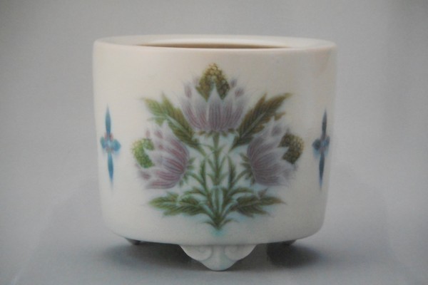 【彩磁花卉文香炉】波山の彩磁は、一色塗っては焼成を繰り返す手間がかかるものでした。