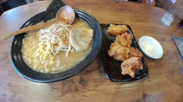 またかなり久しぶりの平日夜に再訪。今回は基本的で看板メニューとされる「熟成赤マル味噌らーめん」とクーポンで唐揚げ(5個)を注文。到来した浅めの丼には、やや甘めの赤味噌スープに中太麺が浸り、約7-8mm厚の豚バラ炙り叉焼1枚、板海苔1枚、炒め野菜(もやし/ニンジン/豚挽肉)にコーンが載っています。熱々な仕上がりで、寒夜には良いです。唐揚げはそこそこ大きめで、マヨネーズが付いています。やはり熱々で量的にも満足しました。