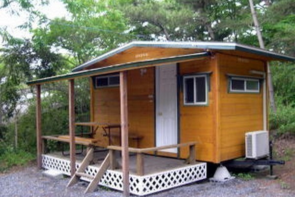 ウッドキャビンは二段ベッド(枕,シーツ等はありません)にエアコン付!ご利用には事前に電話予約を。