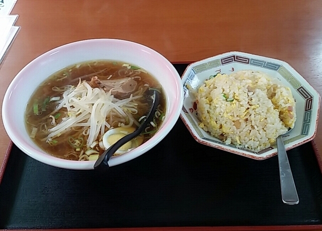 ●ラーメンセット700円 醤油ラーメン+炒飯を選ぶ。 ラーメンは、 あっさり系で味はうすめ。 麺は細麺で、 チャーシュー、玉子の、 トッピング。 炒飯もうすめの味つけの、 やわらかめ。