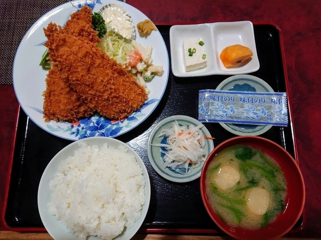 日曜昼に初めて訪れました。地元でかなり長く営業しているような年季の入った佇まいで、カウンター、卓子2に小上がりの卓子2と、割りとこぢんまりな感じ(奥座敷もある?)。前客1名に後客2名とチト寂しい。こちらのお店のお勧めは「アジフライ定食」とのことですが、今夏のアジは40年ぶりの大不漁のためか、通常より小ぶりになっていることのお詫びと若干料金を割引いて提供している旨の貼紙がありました。本日の定食の中から「ミックスフライ定食」を注文。やがて到来した膳には、フライ(海老フライ1尾+タルタルソース/アジフライ1個+和辛子/ポテトコロッケ1個)とサラダ(千切りキャベツ/ポテトサラダ)を盛った主皿、アミ佃煮とカットオレンジの載る小皿、漬物小皿(カブの醤油漬)、小丼盛りのご飯につみれ汁(鰯つみれ/刻みワケギ)が並んでいます。各フライはまあ普通に美味しく、副菜が多彩で量多めなのが良いです。ご飯は大盛またはお替わり1杯は無料とのことで、副菜が余るほどなので1杯お替わりし満腹となりました。
